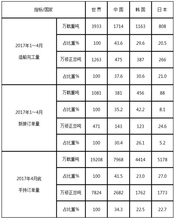 2017年1~4月份世界造船三大指標(biāo)